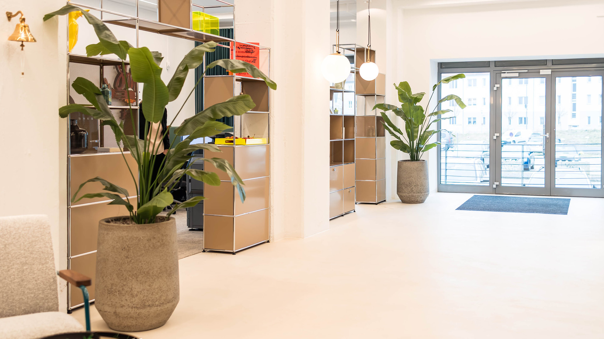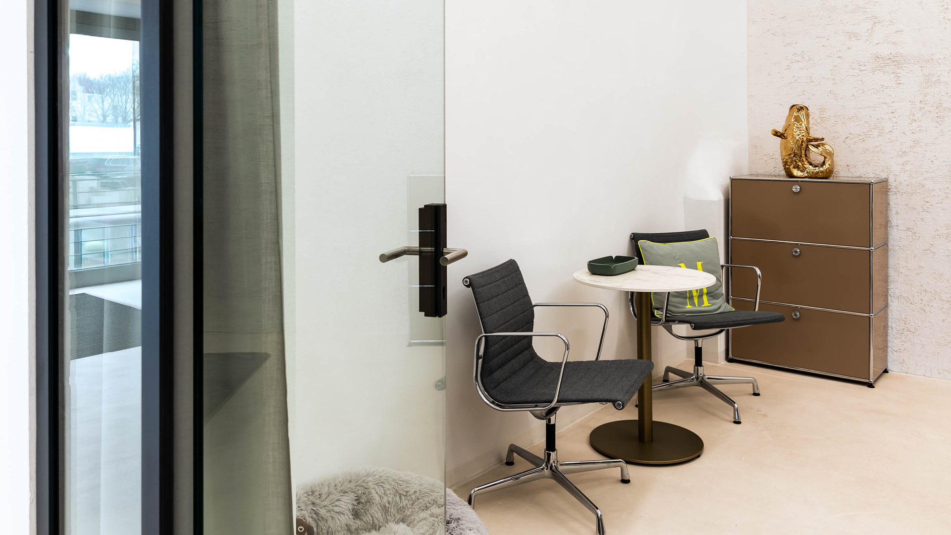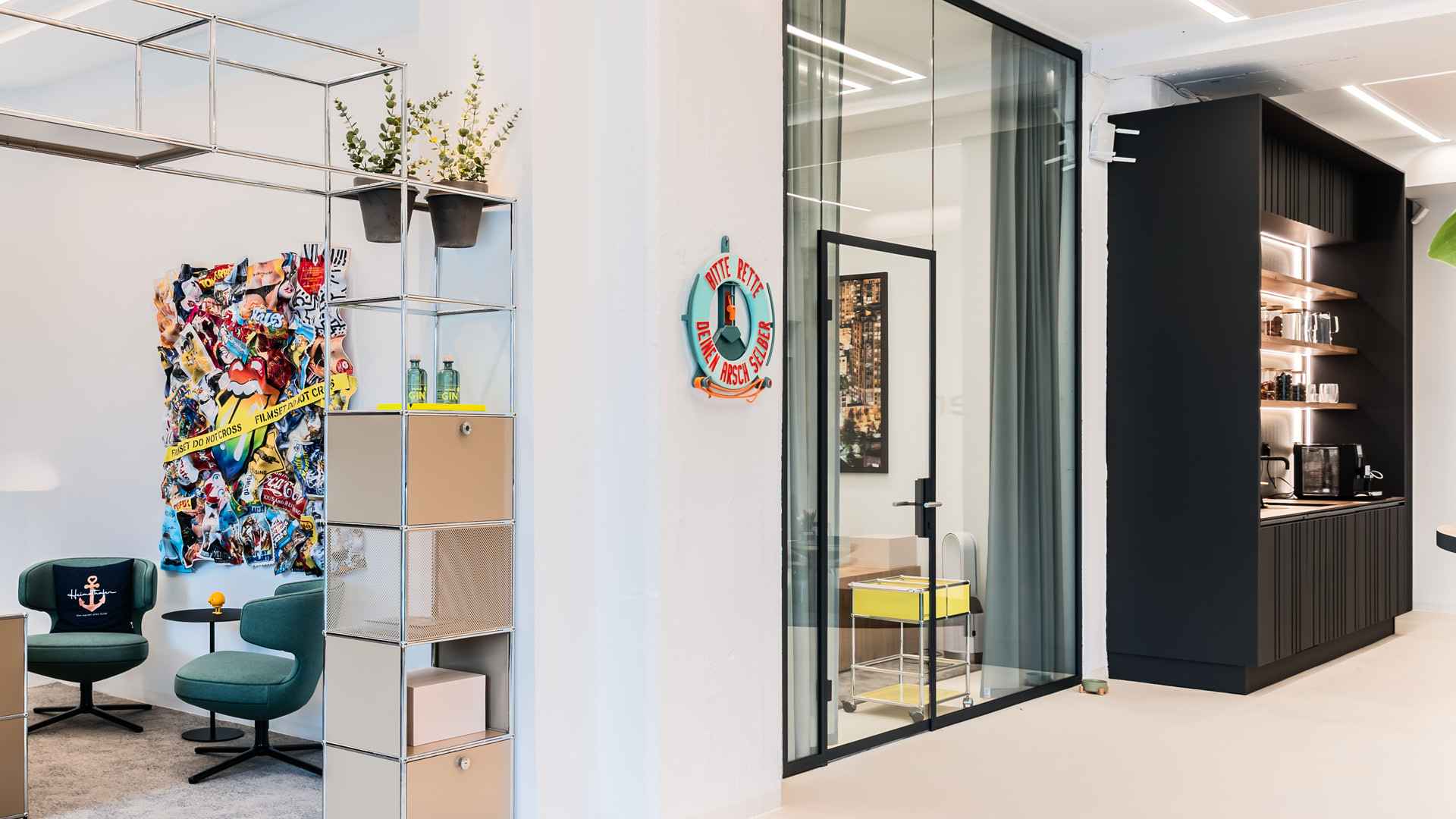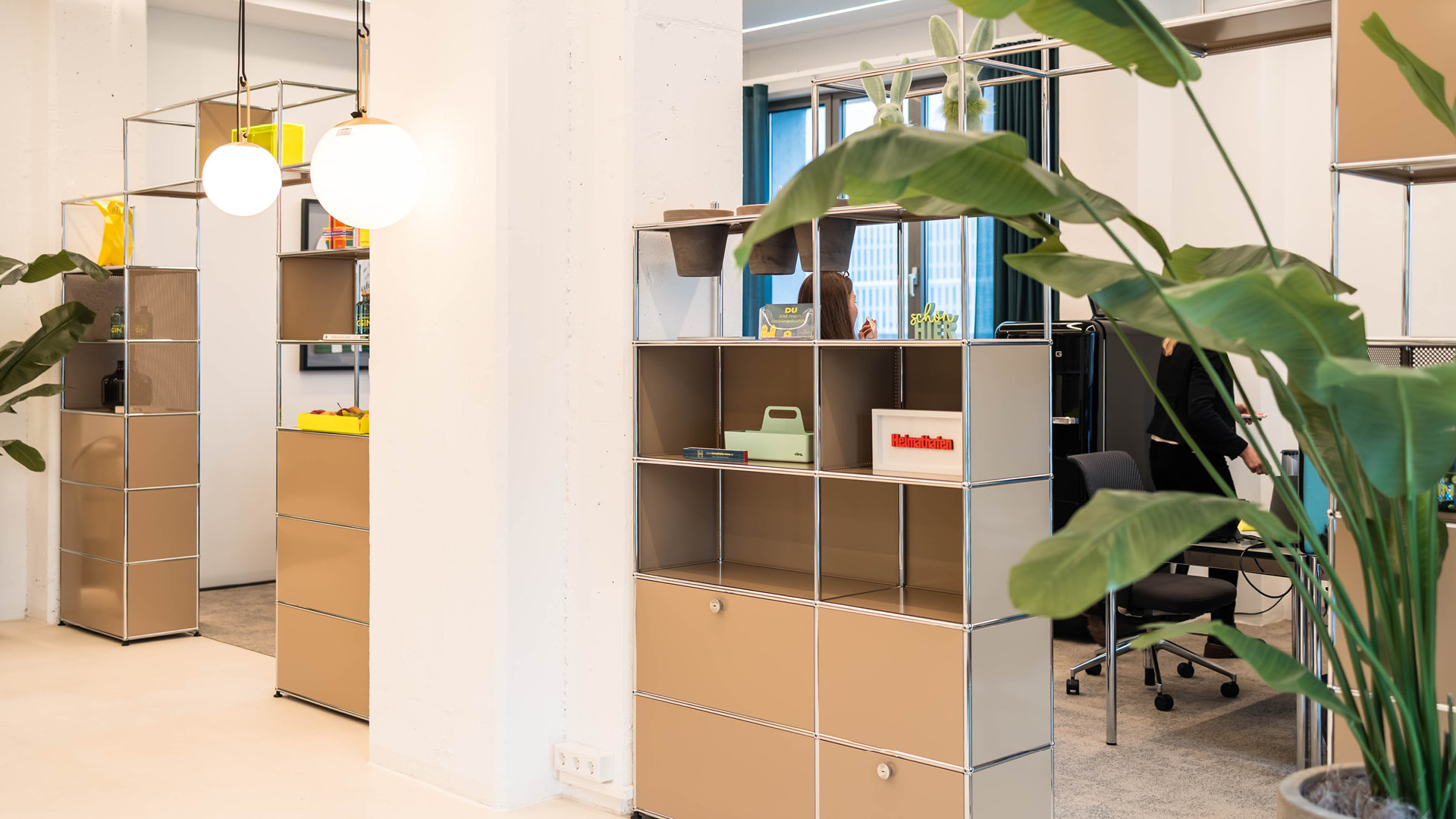 Zentrale Elemente sind Glastrennwände, die visuelle Offenheit erhalten und gleichzeitig funktionale Abgrenzung schaffen sowie Vorhänge und Teppichflächen, die akustisch wirksam sind und Bereiche differenzieren. USM Haller Möbel geben als raumbildende Elemente Struktur, ohne den Raum zu schließen.