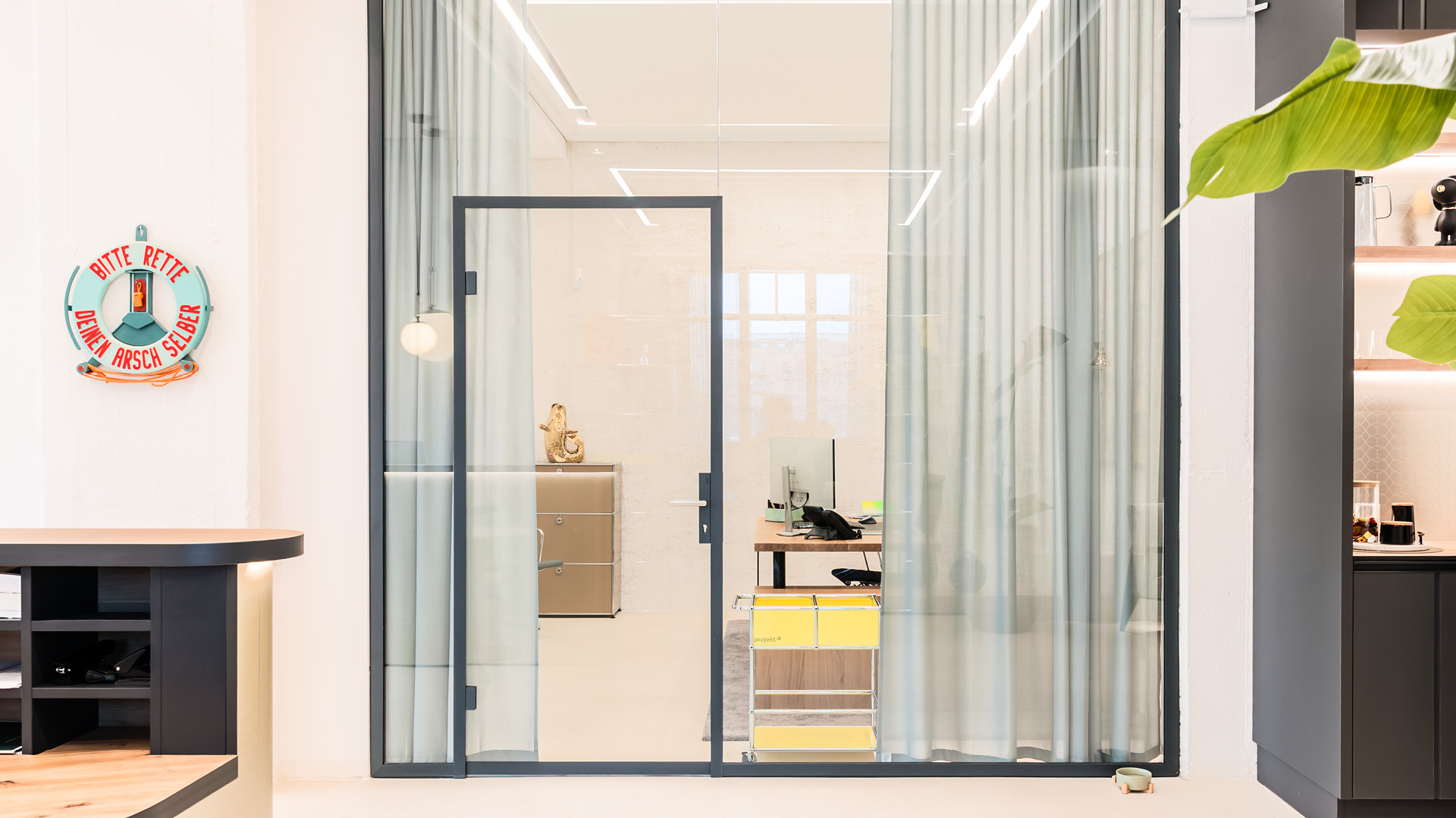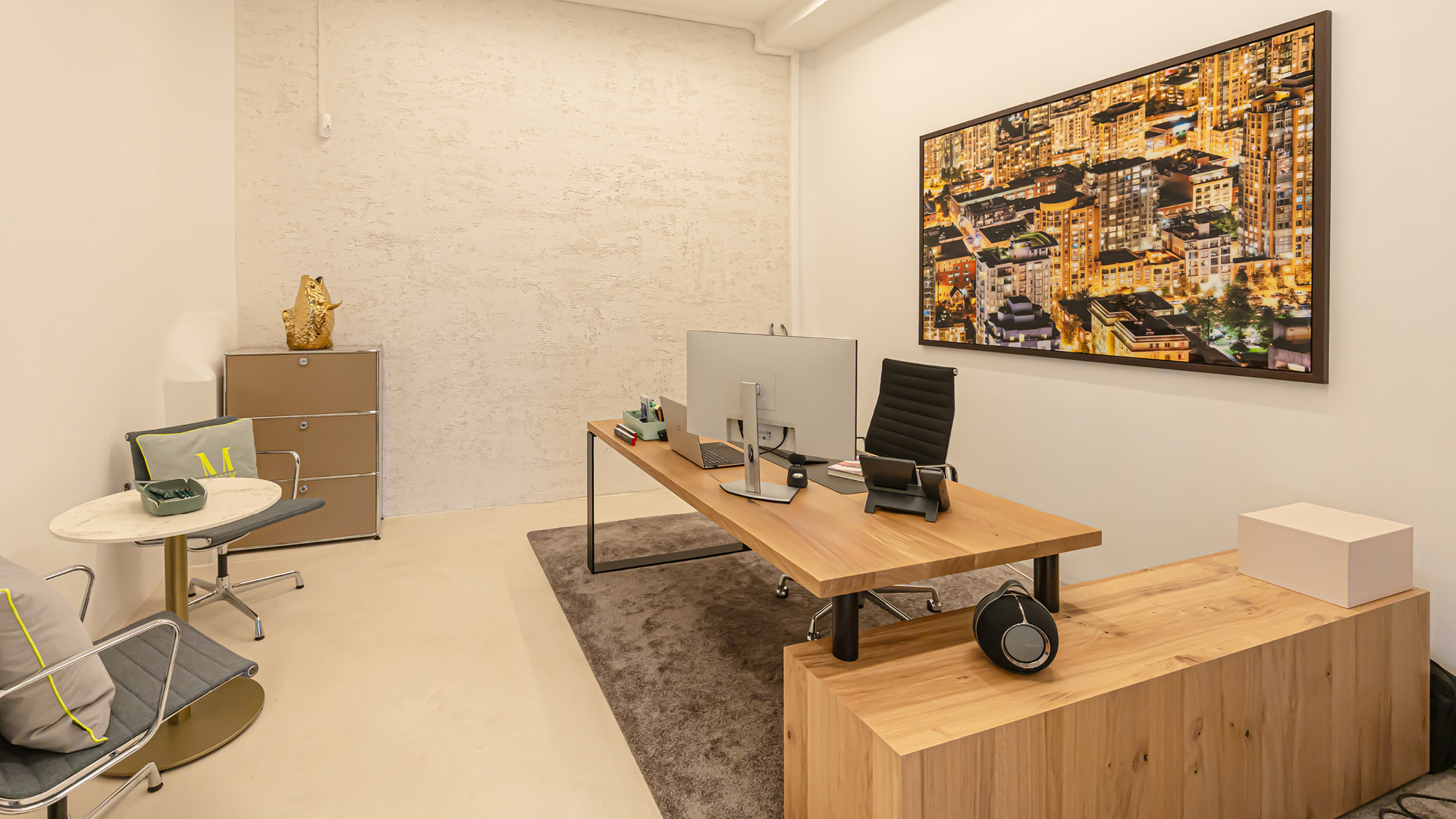 Die Ausgangssituation war typisch für galeriegeprägte Räume: großzügig, offen, visuell stark – aber akustisch ungeeignet und funktional kaum strukturiert. Gleichzeitig bestand der Anspruch, den Einzug in sehr kurzer Zeit umzusetzen und die Fläche unmittelbar arbeitsfähig zu machen.