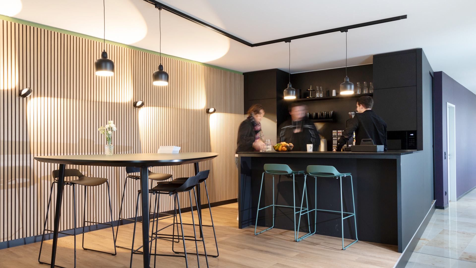 Die Vision des Inhabers der RATIO Unternehmensgruppe, Tim Snoek, war es, aus einem Durchgangsbereich ohne wirkliche Funktion einen Aufenthaltsraum für die Mitarbeiterinnen und Mitarbeiter zu schaffen, der zu jeder Tageszeit genutzt werden kann.