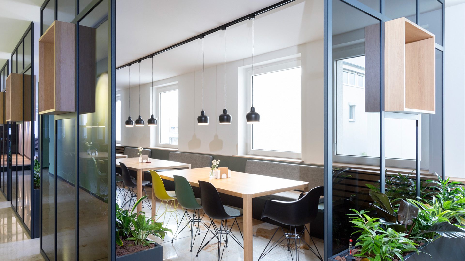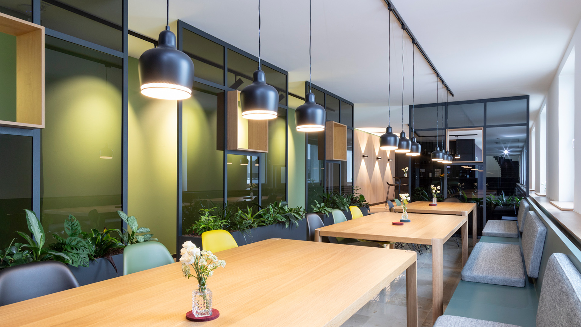 Die gestalterische Herausforderung bestand darin, den langen, schmalen Raum zu optimieren. Wir installierten eine komplett neue Küche mit entsprechendem Abstellraum und setzten den Coffee Point auf ein Podest. Den Pausenbereich haben wir mit Rauchglaselementen zoniert und die Lounge mit einem Vorhang abgetrennt. Zusätzlich gliedern verschiedene Wandfarben und Wandpaneele sowie unterschiedliche Beleuchtungselemente den Raum. So konnte eine warme, einladende Atmosphäre geschaffen werden, die dazu anregt, in der Pause auch mal abzuschalten und zu entspannen. Die Auswahl an Pflanzen unterstreicht das wohnliche Ambiente und trägt zur Wohlfühlatmosphäre bei. Das Raumkonzept wird durch Dekorationselemente ergänzt, die dem Raum eine individuelle Note verleihen.