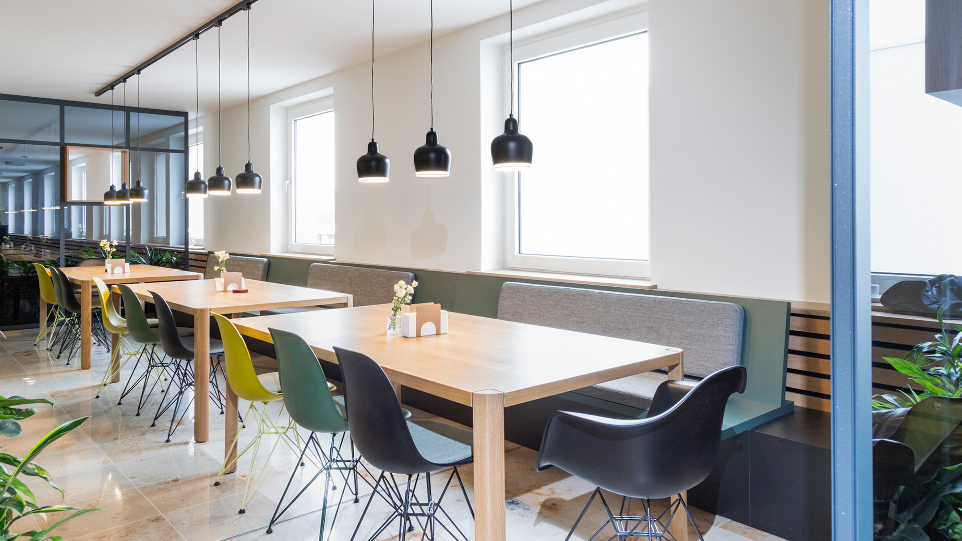 Restaurant mit Tischen und Stühlen, Referenzprojekt von projekt k in Münster, Lounge-Einrichtung bei RATIO Unternehmensgruppe.