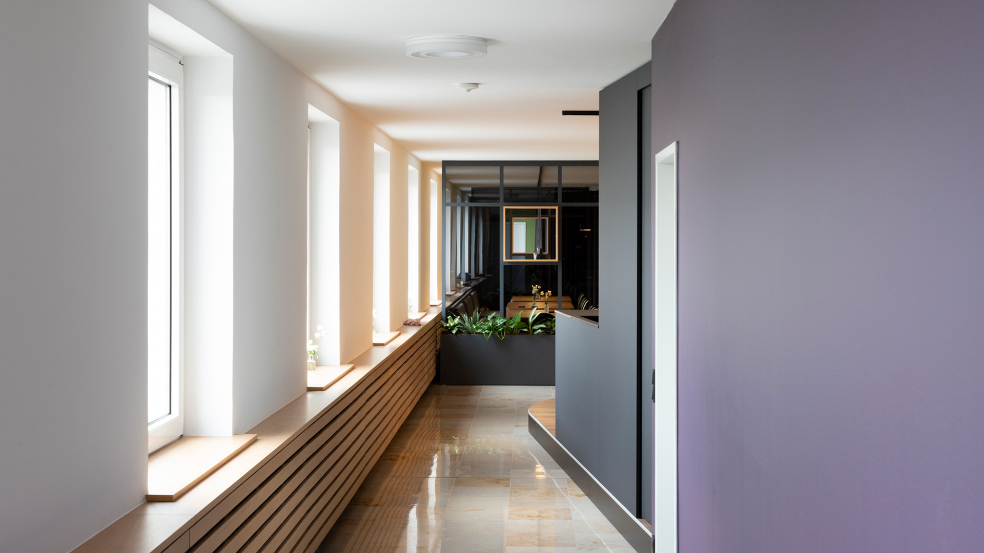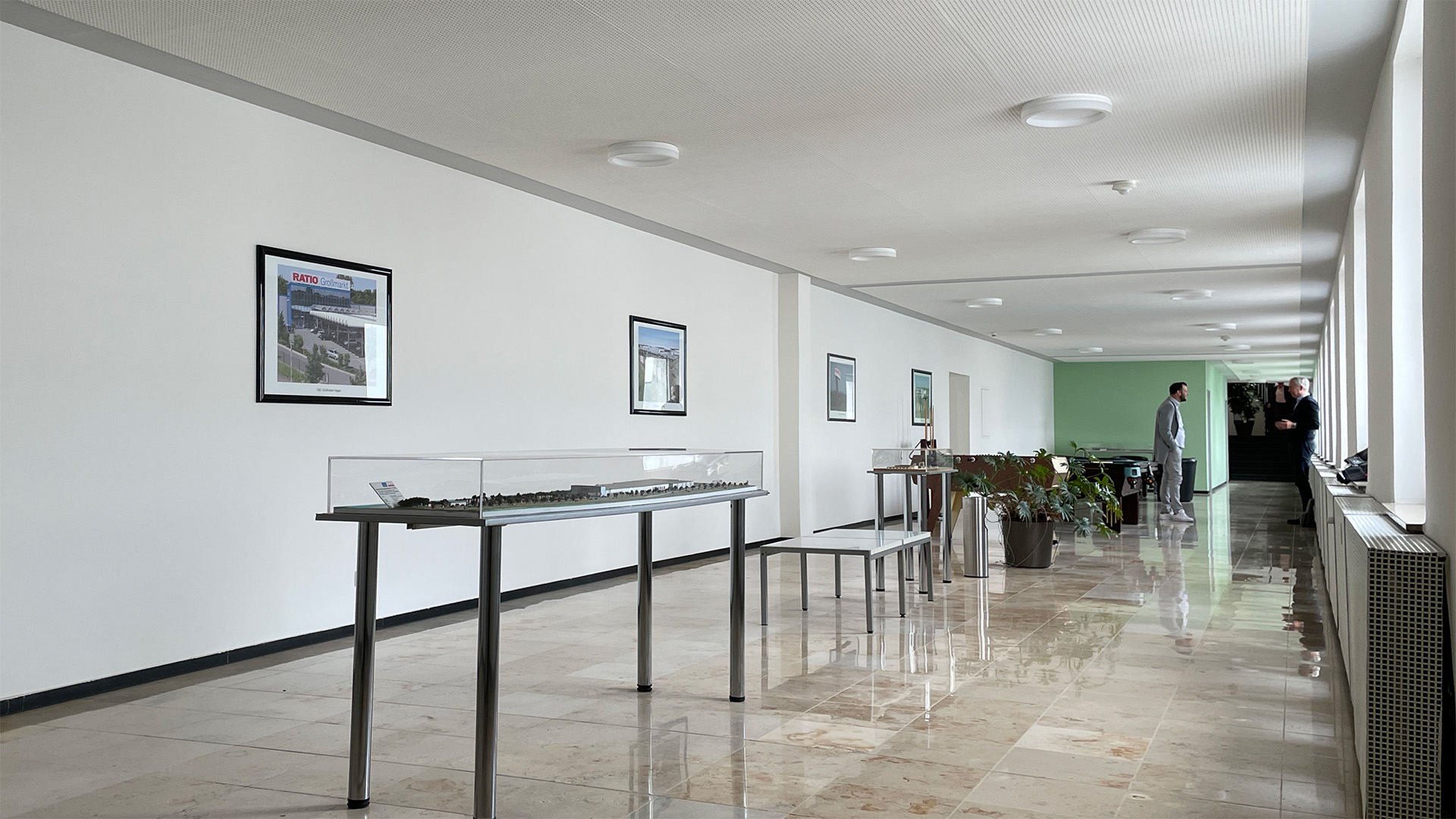 Ein langer Flur mit einem Tisch und Stühlen in der Lounge der RATIO Unternehmensgruppe vor dem Umbau.