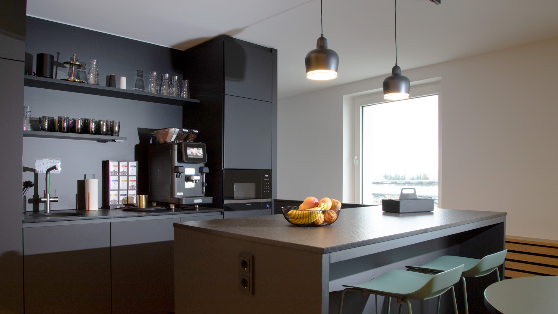 Küche mit Theke und Spüle im Referenzprojekt von projekt k in Münster, Lounge-Einrichtung bei der RATIO Unternehmensgruppe.