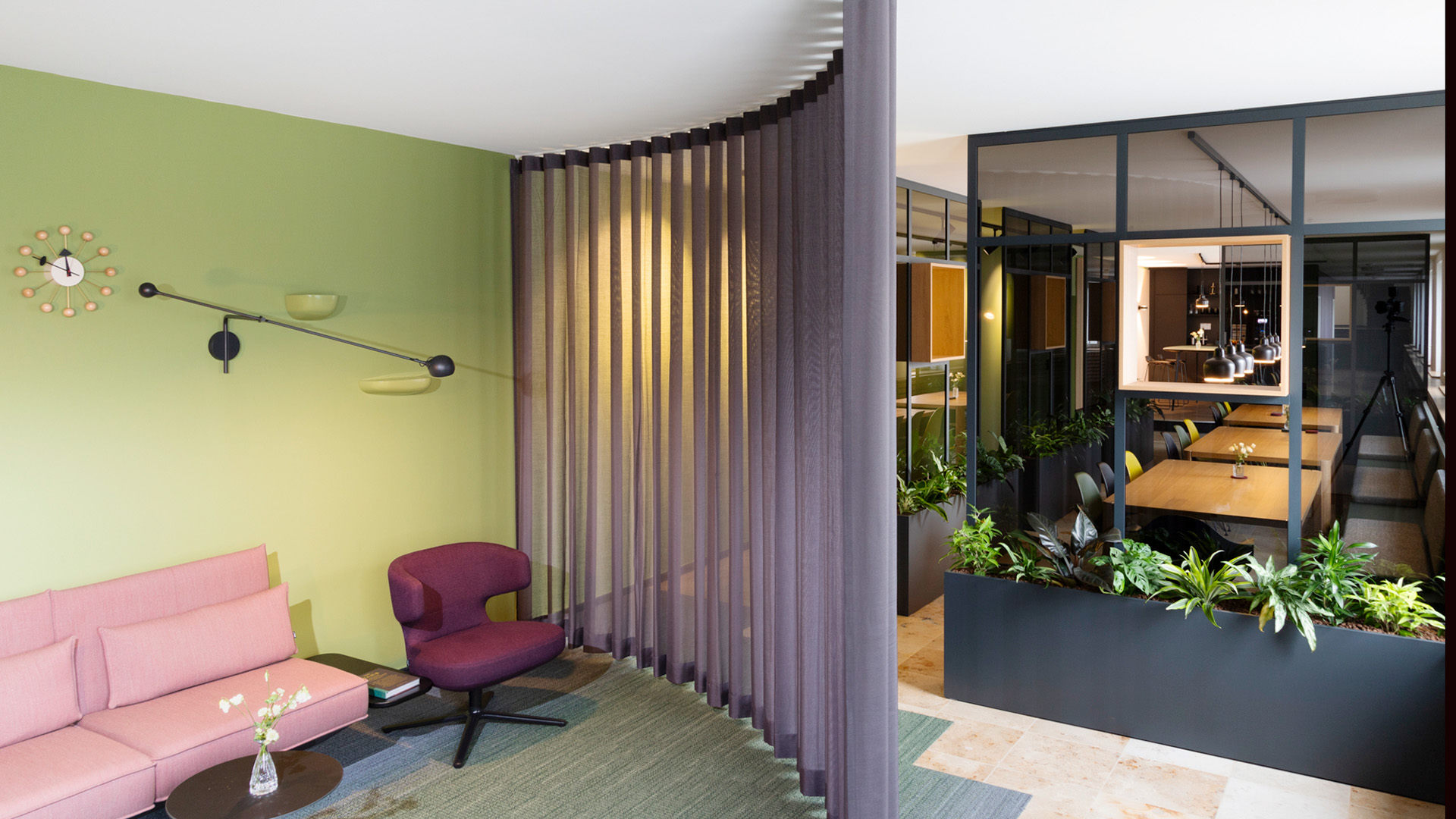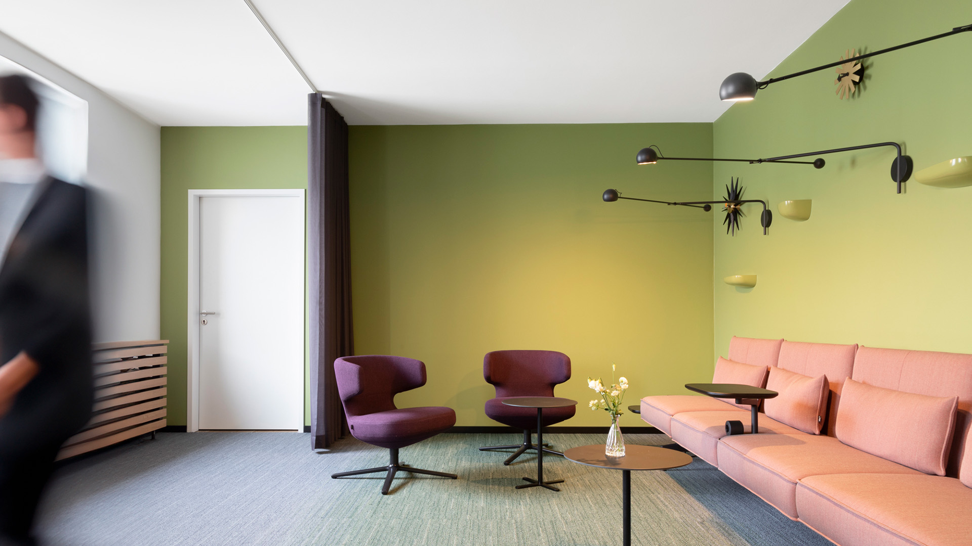 Büro mit grüner Wand und lila Couch, Referenzprojekt von projekt k in Münster, Lounge bei RATIO Unternehmensgruppe.