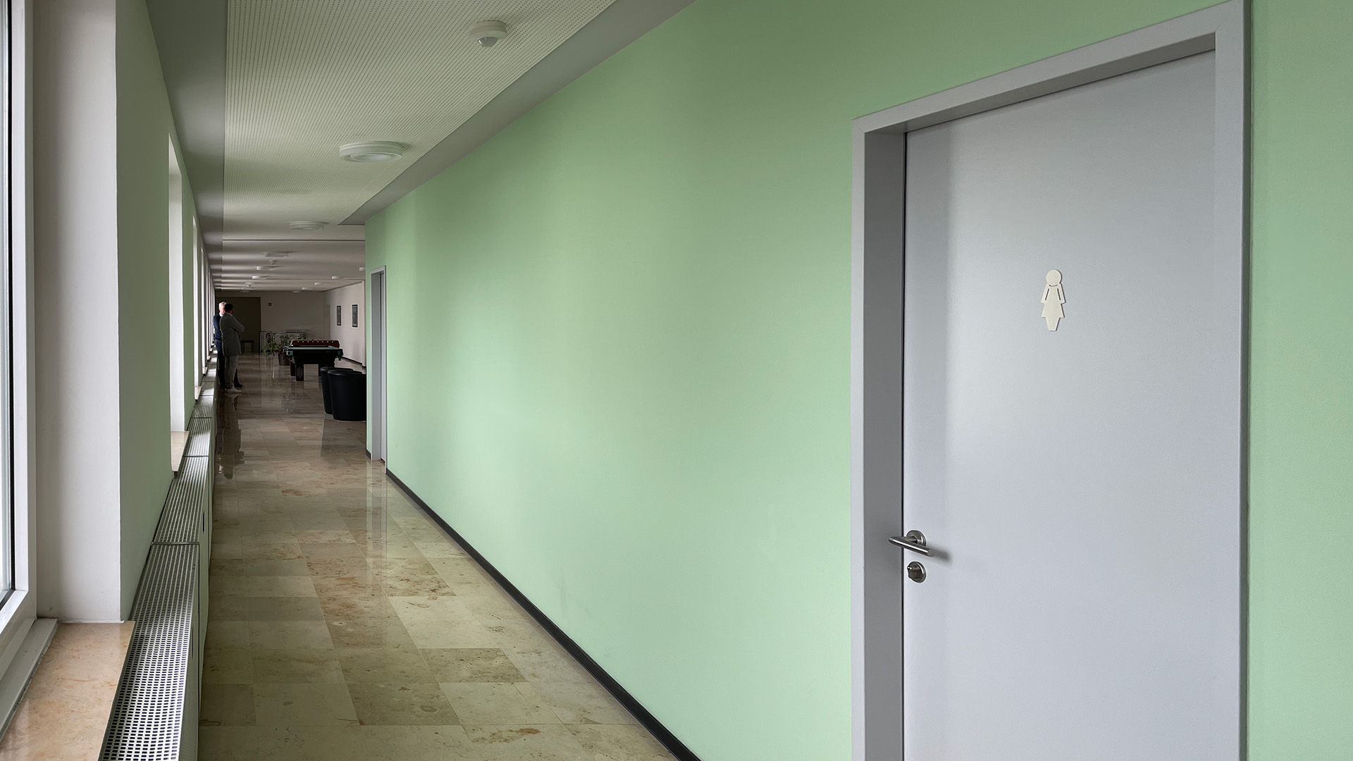 Ein langer Flur mit grünen Wänden und weißen Türen in einem Referenzprojekt von projekt k in Münster. Vor dem Umbau bei der RATIO Unternehmensgruppe.
