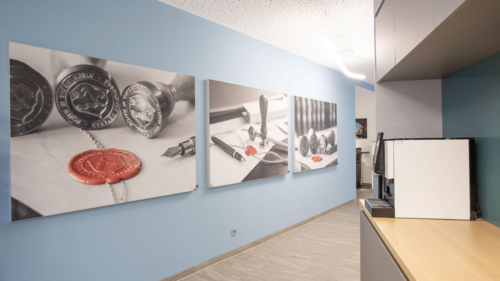 Akustisch wirksame Wandpaneele, deren Motive individuell für die Kanzlei von einem lokalen Fotografen zusammengestellt wurden, bilden einen runden Abschluss.