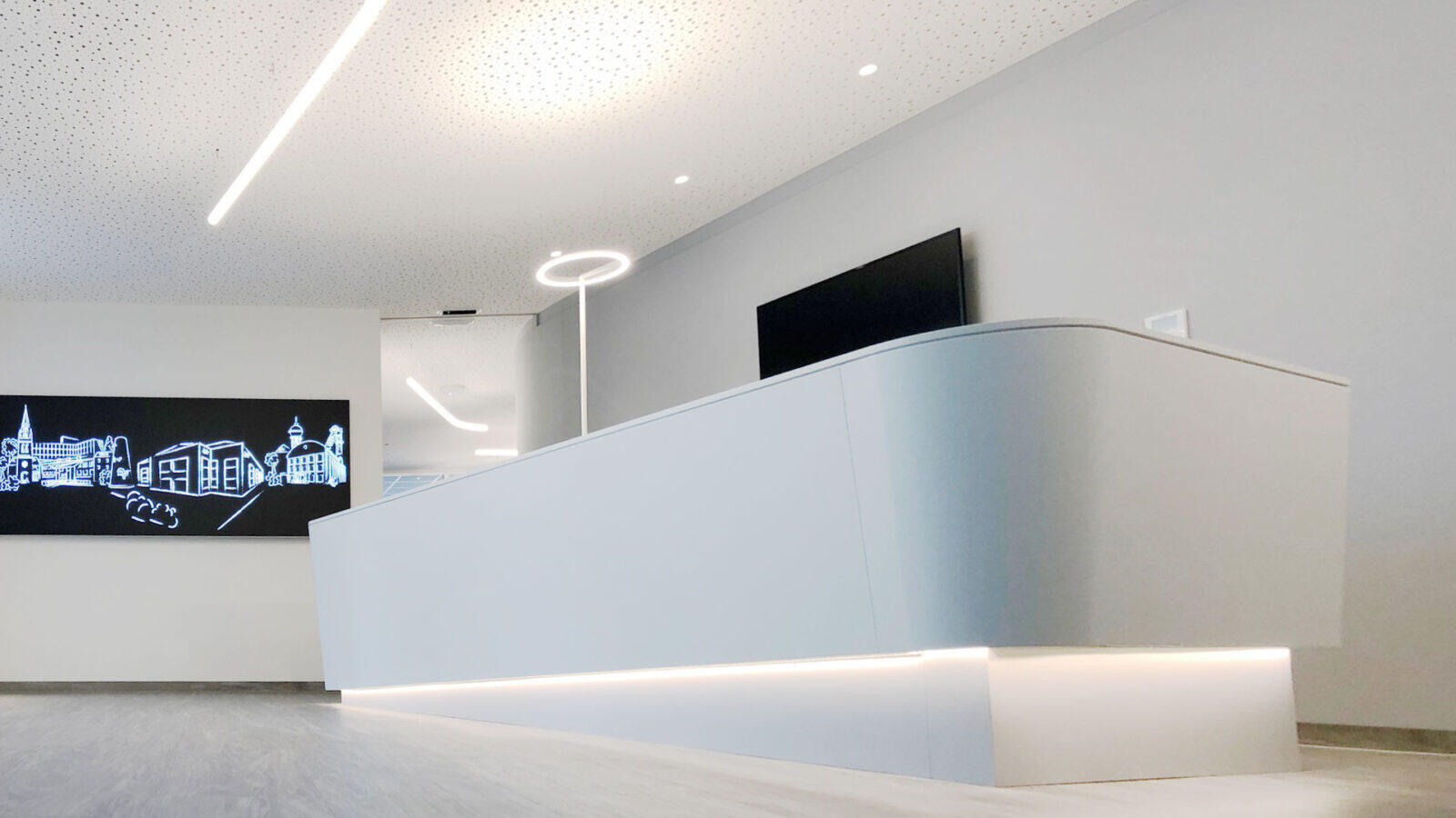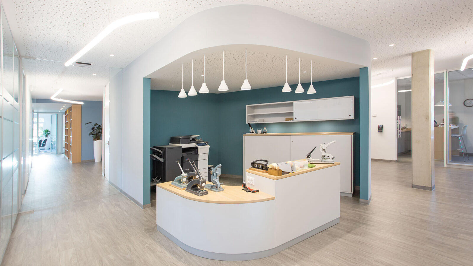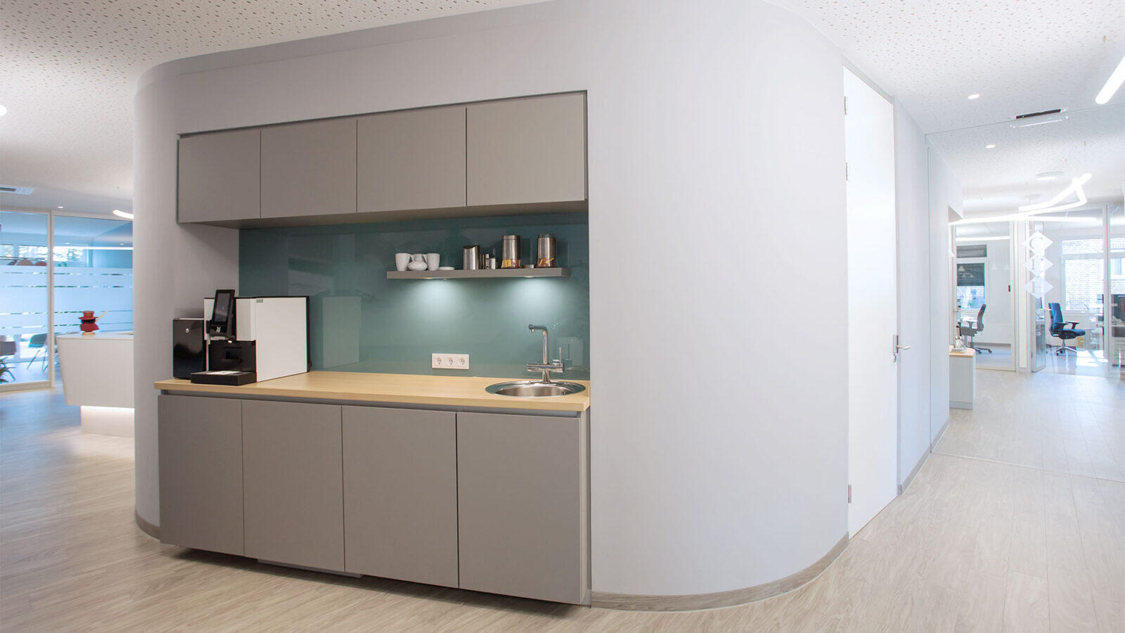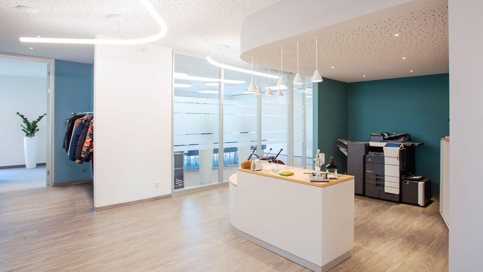 Über das gestalterische Gesamtkonzept inklusive der Beleuchtungs- und Akustikplanung hinaus lieferten wir Glastrennwände, individuelle Festeinbauten wie Empfangstheke oder Teeküche, diverse Funktionsmöbel und lose Möbel für die Konferenz- und öffentlichen Bereiche. So entstanden moderne, freundliche und lichtdurchflutete Büros und Besprechungsräume mit modernster Präsentationstechnik und Blick ins Grüne.