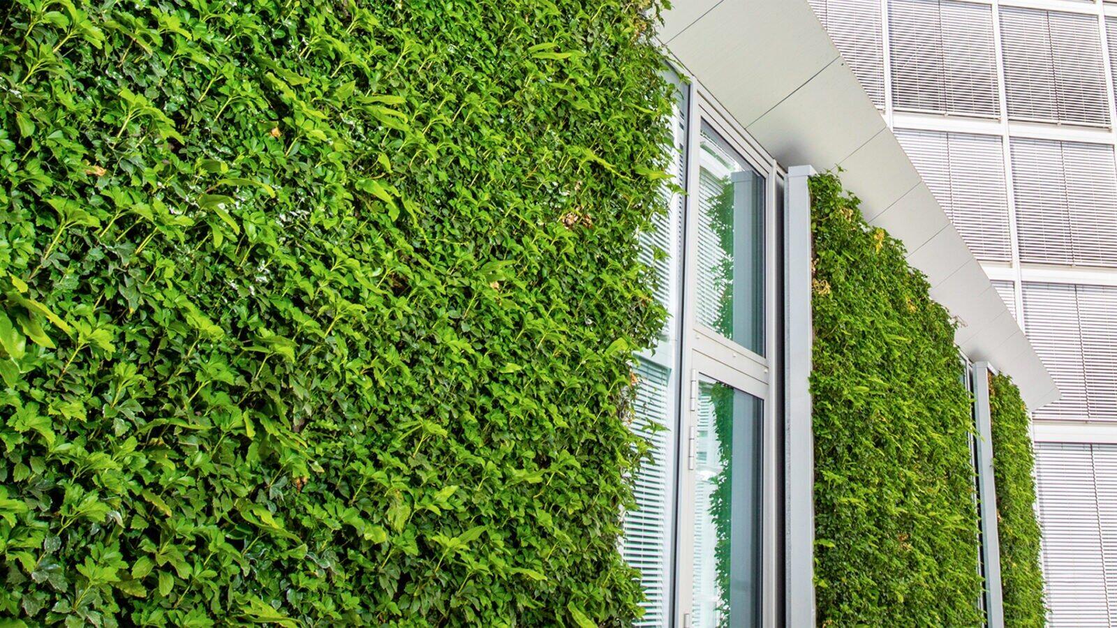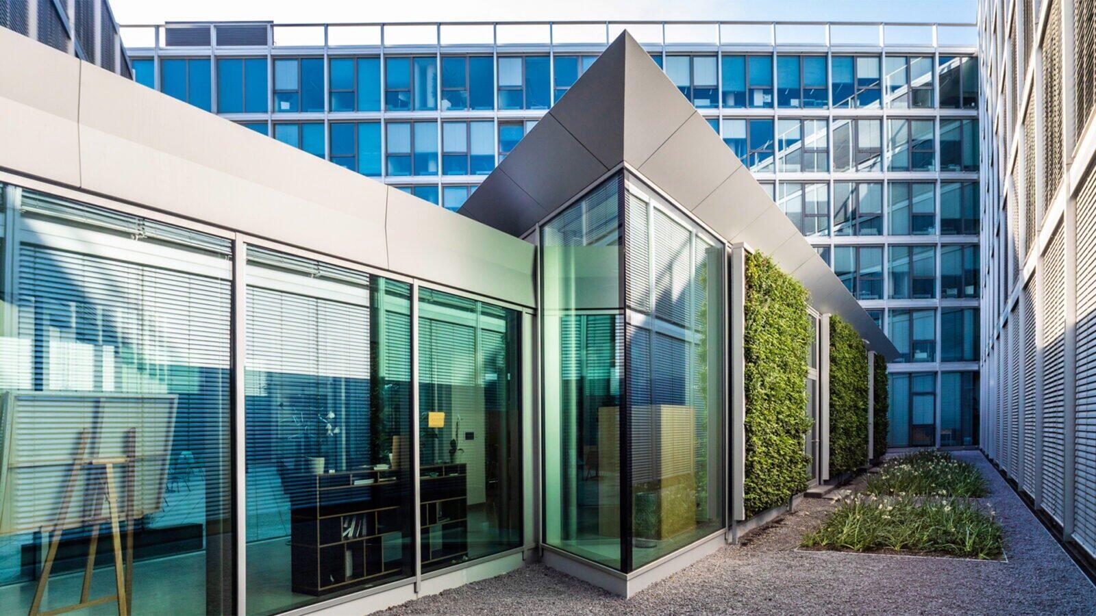 So lautete der Auftrag an den Architekten. Der dreieckige, gläserne Pavillon, der sich perfekt in den Innenhof der Konzernzentrale in Neuss einfügt, soll den digitalen Aufbruch der RheinLand Versicherungsgruppe symbolisieren. Mit Blick auf die Umwelt wurde viel Wert auf eine Dachbegrünung und auf begrünte Außenwände („vertikale Gärten“) gelegt.
