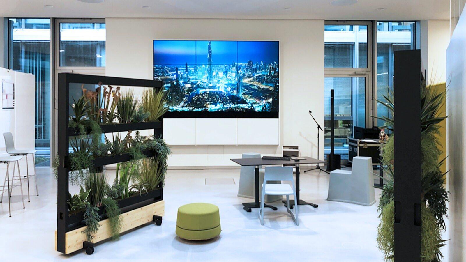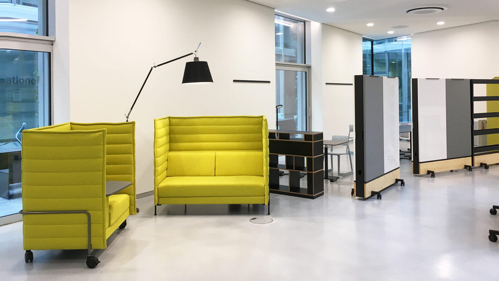 Der Innenraum ist multifunktional: Alles ist mobil und die gesamte Fläche so für Präsentationen und Veranstaltungen nutzbar. In einer offenen und kommunikativen Arbeitsatmosphäre haben alle Mitarbeiter die Möglichkeit, mittels agiler Methoden projektbezogene Lösungen zu entwickeln. Hier sitzen die kreativen Köpfe, die neue Denkweisen, Methoden und Arbeitsabläufe, Prozesse und Produkte, Services in die gesamte Versicherung tragen. Deshalb steht die Zukunftswerkstatt allen Mitarbeitenden offen und ist über einen Durchgang vom gut frequentierten Eingangs- / Kantinenbereich zentral zugänglich.